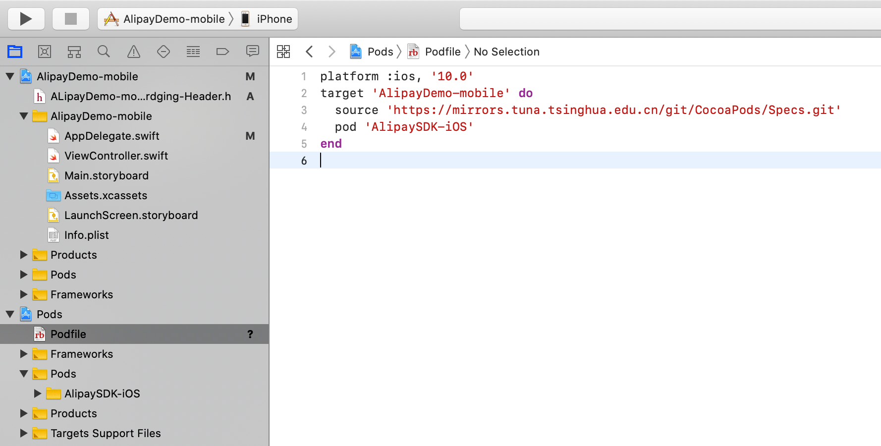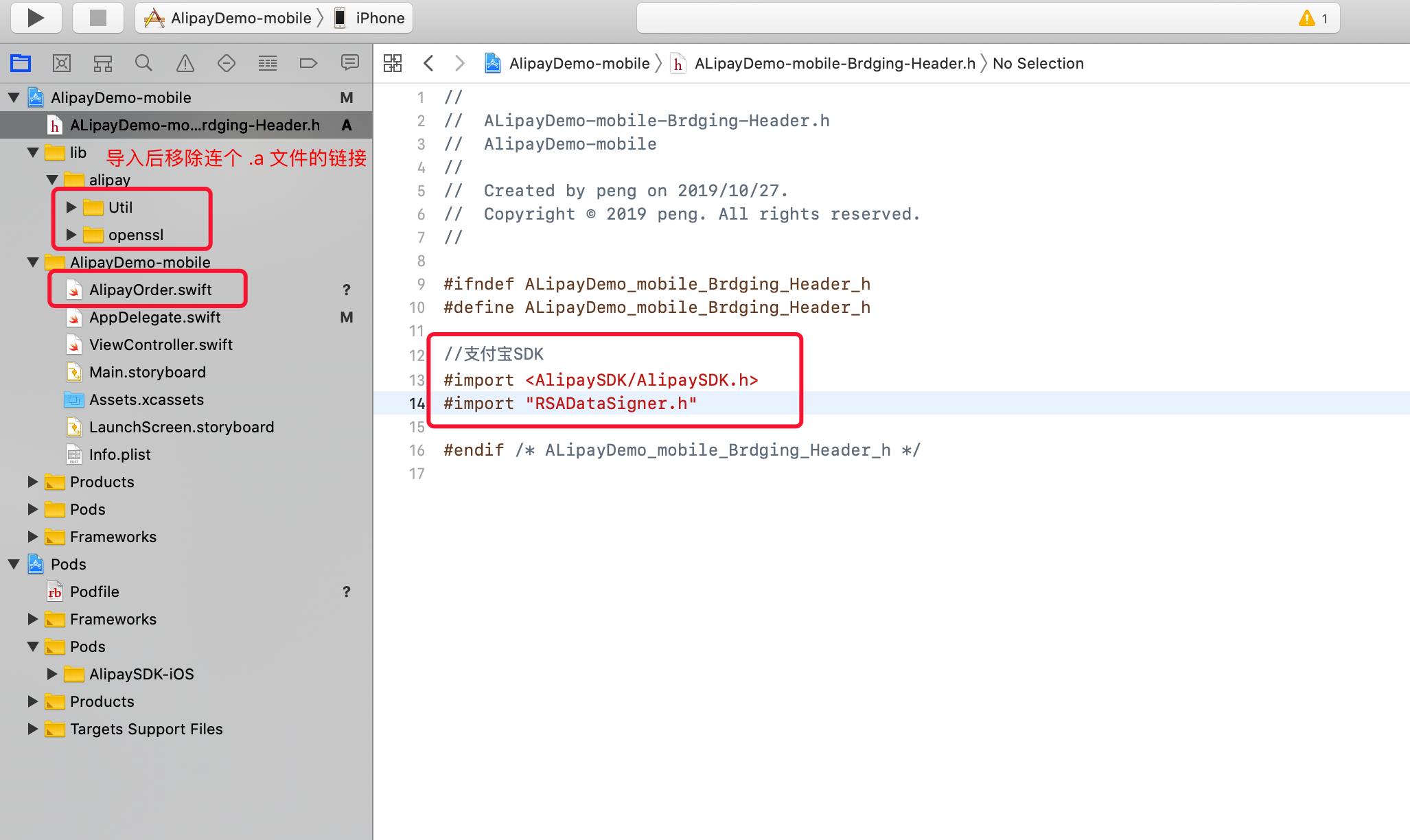 本demo使用CocoaPods导入支付宝SDK,创建Brdging-Header.h文件(点击查看参考)